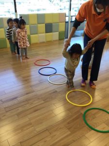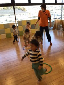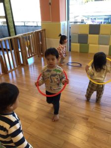 フープ遊びは夏にも一度行いましたが、フープを並べると子どもたちは早速上手に輪の中をステップして渡っていて成長を感じました?