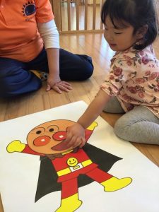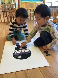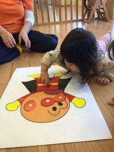 保育士が「目どうぞ〜」と声をかけながら手渡していくと、「ここかな・・?」「目だ!」と子どもたちなりに考えながらパーツをおいています✨