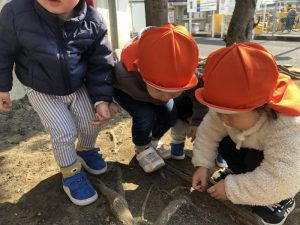 子どもたちは「ムシ!!」と発見の喜びを保育士に伝えてくれたり