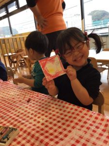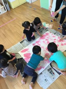 「くすぐったいよ~」と笑顔を見せながらペタペタと模造紙に手形を付けていました。