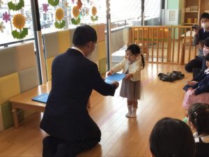 本日は卒業式がありました。今週はずっと寒い日が続いていましたが、今日はお天気もよく春の暖かさとともにみなさんと卒園式を行うことができました?