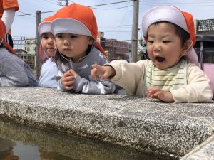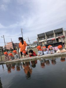 春らしいお天気となり、子どもたちもうきうきでお散歩へ向かいます♪この日は子どもたち御用達の池へ、、