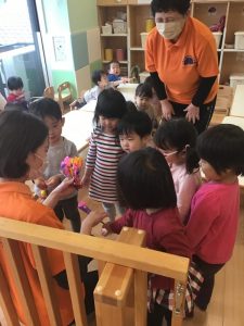 今年度で異動になる保育士もおり、りんご組のみんなで一本ずつお花を作って贈りました?全部合わせると素敵な花束になって、卒園で歌った『ありがとうの花』を彷彿とさせます❤︎