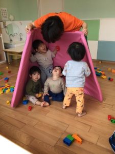前年度からの在園児はりんご組さんやいちご組さんに進級し、「ぼくりんごさん!」「いちごなの」と教えてくれる子もちらほら。。。自分が進級したことをちゃんと理解していて、喜びを感じながら過ごしています。さっそく新しいお友達のお手本になってくれており、保育士も頼もしく感じています??