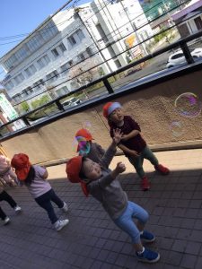 天気の良い日は園のテラスへ出てシャボン玉遊び?などをたのしんでいますよ!