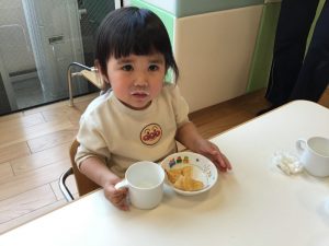 サンライズキッズでは午前中はこのような市販のおやつですが、