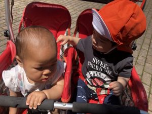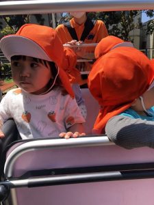 いちご組さんやもも組さんのお友だちは、バギーから見える風景に興味津々でキョロキョロしています?