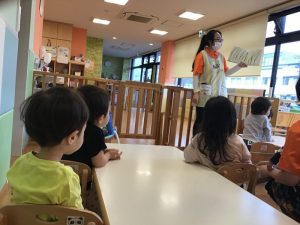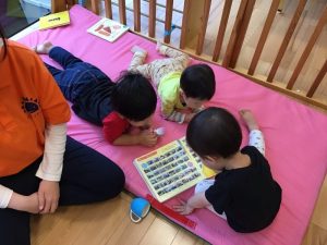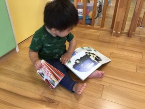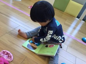 お部屋ではブロック遊び?が大好きな子どもたちなのですが、最近は絵本にも興味があるようで気がつくと絵本コーナーから気になる絵本を取り出して開いています??