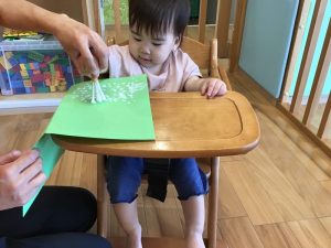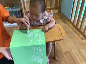 しゅわしゅわを作るため、綿棒でチョンチョンと色付けを一緒にやりました?まじまじと画用紙を見つめたり、力を込めてしっかりスタンプできる子どももいましたよ??