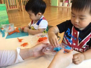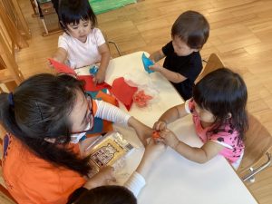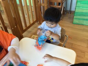 いちご組さんでは立体的なアイスクリーム作り??花紙を丸めてビニールに詰めるのを子どもたちが行いました!!保育士と協力してぎゅっきゅと詰め込みます(^.^)色とりどりの花紙で、美味しそうなアイスクリームができそうです??