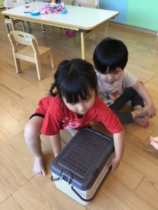 中を覗き込んだり、入れたものを出したりと遊びながら製作を楽しみました??