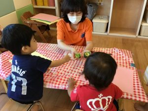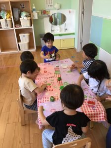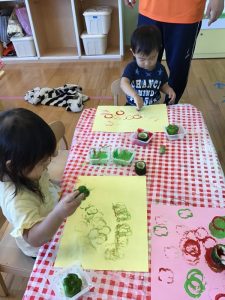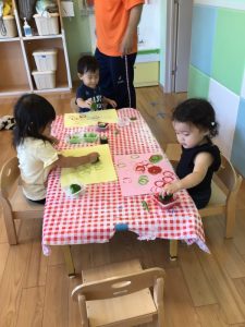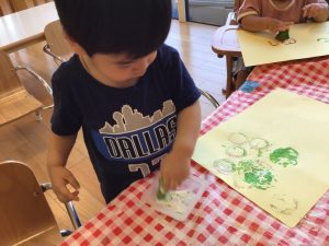 今回は全クラスで行なった、夏野菜スタンプの製作の様子を紹介致します✨