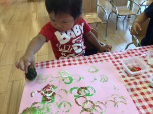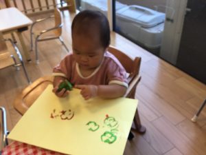 1回押す毎に保育士の顔を見てにっこりする子どもや、ひたすら緑の絵の具で押し続ける子どもなど個性が出ていて面白いですね