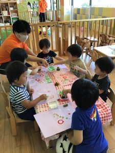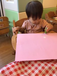 少し前の製作では保育士にお手伝いしてもらっていたもも組の子ども達ですが、今回は自分で握ってペタペタしており、子ども達の成長を感じました✨