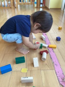 この後高く積み木を積み上げたのに、自分で倒して遊んでいました