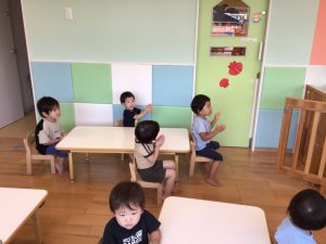 初めてでもこの対応力、、!!特にりんご組さんは『むずかし〜』と言いながらも真似っこが上手で、保育士と楽しんでやっていました💕