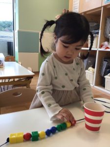 穴の空いた丸や四角い積み木に紐を通すのですが、