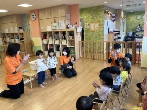 「たんたんたんじょうび」の歌を歌い、保育士も子どもたちもニコニコ笑顔になりました😊💖