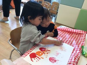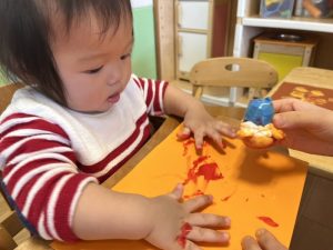 もも組さんは手のひらでペタペタしたりスタンプでポンポンしたり、真剣な表情はまるで芸術家のようです☺️