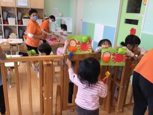 大きな柿を持っているサルでしたがお腹が空いている様に見えたのか、いちご組さんのお友達は持っていたブロックで作ったアイス(?)をサルにあげていました😆