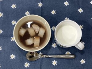粥 味噌汁(大根) 白身魚と野菜のくず煮 煮りんご