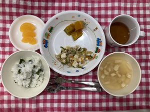 わかめごはん 味噌汁 豆腐チャンプルー かぼちゃの甘煮 みかん缶