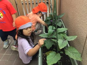 ナスが少しずつ成長してきており、「出来ているよ」とお友だちと観察を楽しんでいました♪