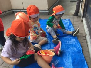 りんご組🍎はテラスでナスを観察したり、型抜きのおもちゃで遊びました。