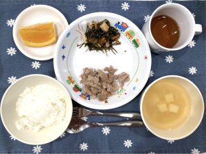 ごはん 味噌汁 豚肉のマーマレード焼き 昆布の煮物 オレンジ
