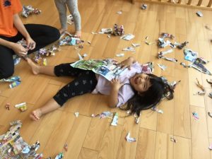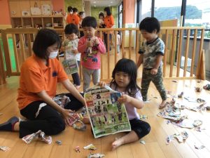 保育士や実習生と広告をビリビリ破いたり、丸めてボールを作り楽しんで遊んでいました。