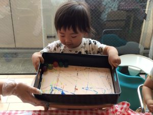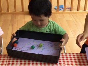 いちご組はスパーボールを使いボールに絵の具を付けてコロコロ転がしました。