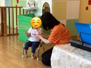 保育士がインタビューで「何歳になりましたか?」と聞くと「2歳」とお指をピースをして