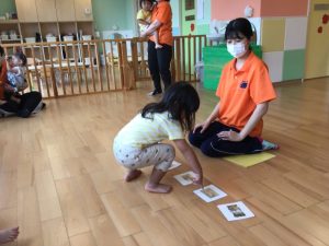 動物のフラッシュカードでは、保育士が出したクイズに対し