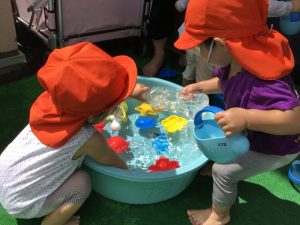 保育士と一緒に型抜きのおもちゃやペットボトルを使って全身で水遊び楽しんでいました。