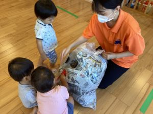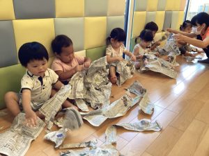 ビリビリと新聞紙を破いたり丸めたり、普段の保育では中々できない遊びにみんなとても楽しそうでした。