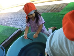 その後、さらにタライの中に食紅で着色した氷を浮かべてひんやり気持ち良さそう🧊✨