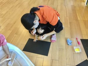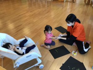 初めて絵の具に触れる子どももおり、保育士が指に絵の具を塗りフィンガーペイントを楽しんでいました。
