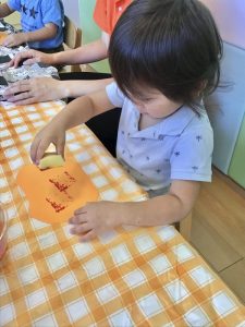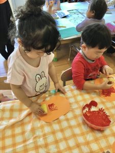 りんご組🍎はスポンジを使ってかぼちゃの形をした画用紙にスタンプをしました♪