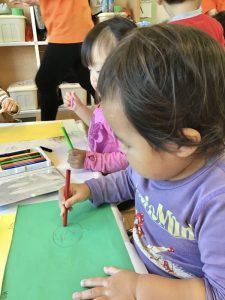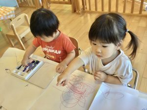 子ども達はクーピーに興味深々の様子で、自由にお絵描きをして楽しんでいました。