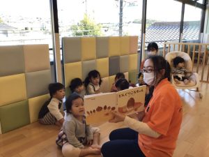 保育士と一緒に「どんぐりはちくりしょ♪」と一緒に歌って楽しんでいた子どももいました。