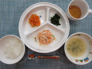 (写真は離乳食後期です。年齢によって盛り付け量を変えて提供しています。)