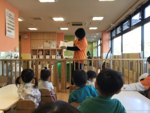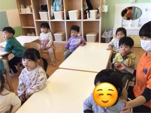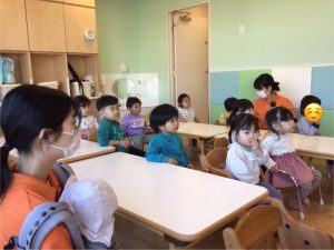 保育士が絵本を読むと子ども達は「ねんねしてる」と言いながら見入っていました。