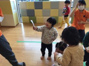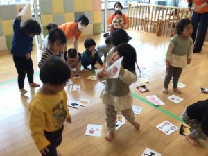 カルタ的絵柄取り大会では、保育士が持っているカードと同じものを探すゲーム!