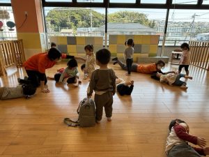 『どんぐりになりましょう』では、コロコロ~と転がって、転がった先のお友達と目が合うと、ニコッとしたり、ちょっと恥ずかしくなったり・・・(〃▽〃)