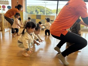 『カエルになりましょう』では、両手を床に付いた姿勢から飛び跳ねて、「クワッ」「ケロッ」 等、声を出しながら飛び跳ねていました!!!