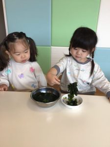 「給食の食材を知ろう」ということで…今回調理される前に触れた食材は「ワカメ」!!