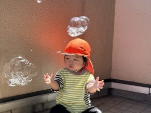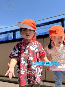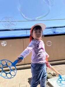 シャボン玉の型を持って、たくさんシャボン玉を飛ばしていたり、お友達が飛ばしたシャボン玉をパチンッと手で割っていたりと楽しく過ごしました🫧