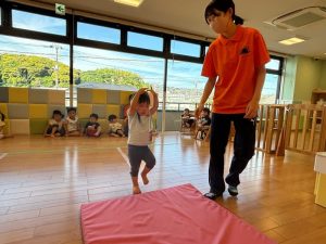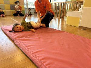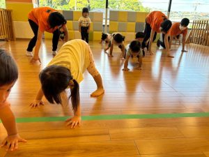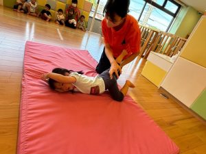 体操カリキュラムでは、普段の生活では行わない動作も取り入れています。