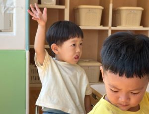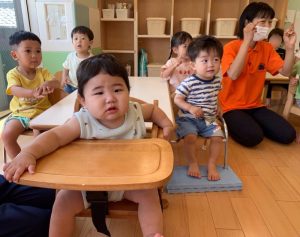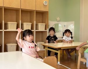 最近になって、手を挙げるようになったお友達や、目を合わせて笑って合図をするお友達が増えました!なにより、自分の名前以外にもお友達の名前も覚えてきていて、お友達にも注目し、今日一緒に遊ぶお友達を意識する、1日のはじまりの合図です☆