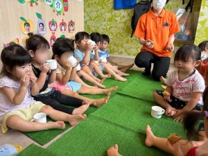 「手を消毒したら地面は触らないんだよ」「落としたものは食べられないんだよ」等、外で食べる時の注意を子どもたちにも伝えます。